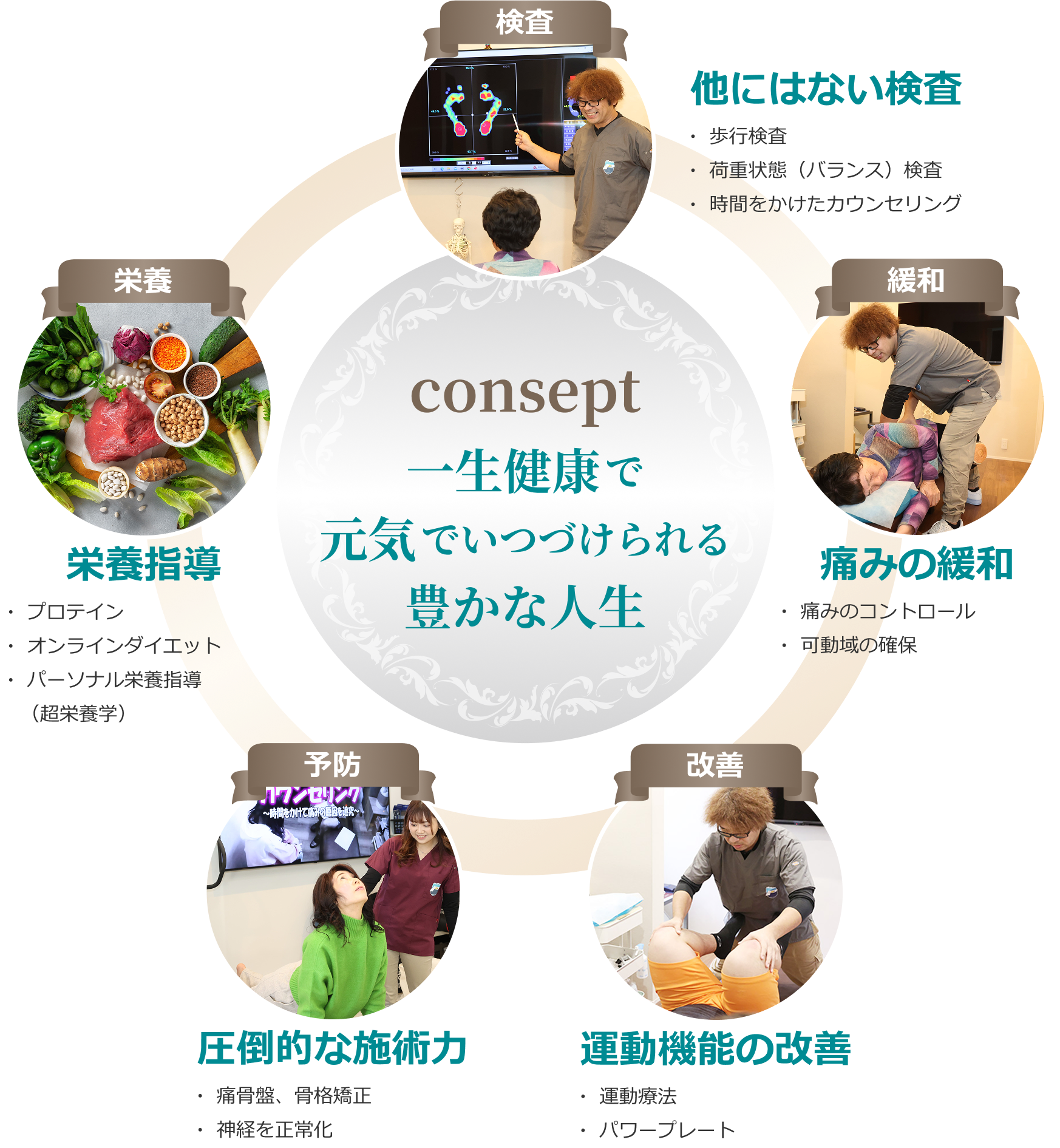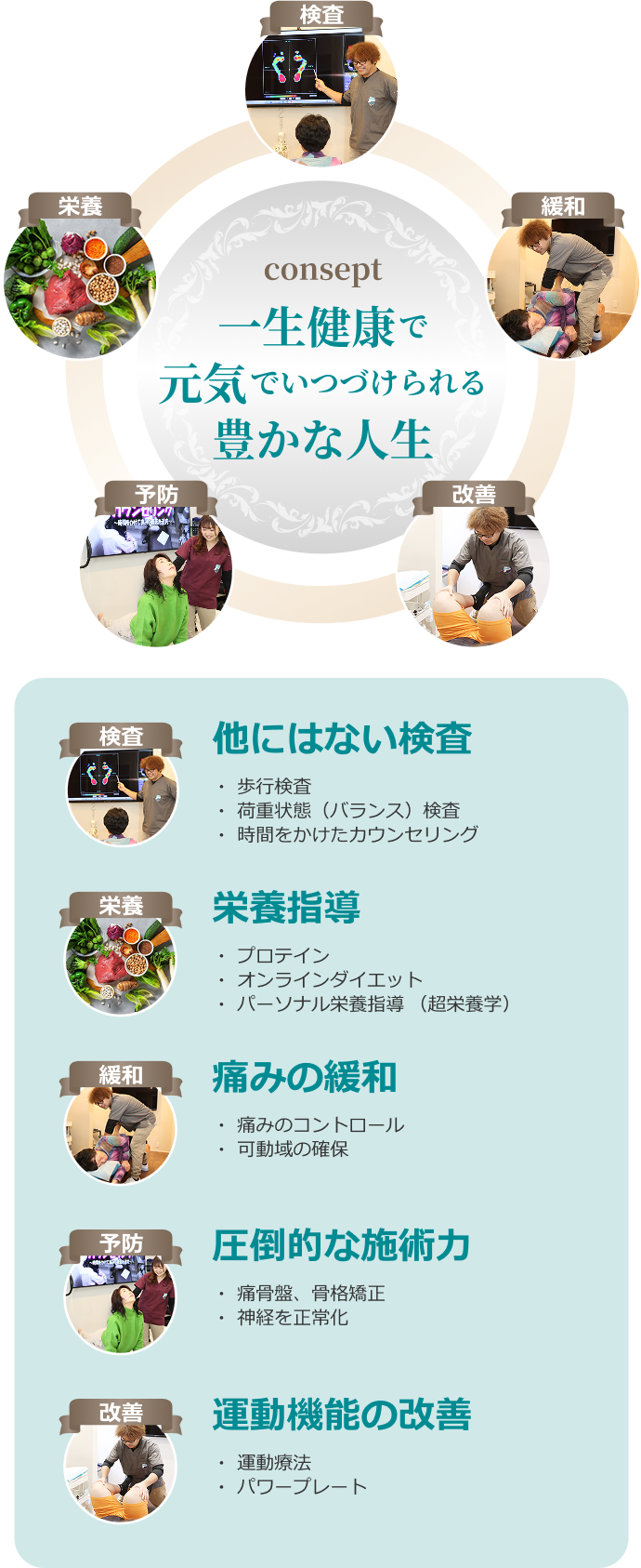 のある箇所やその周辺を揉んだり電気を通したり薬を処⽅するだけの「その場しのぎ」の施術は⾏いません。