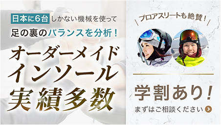 ・プロスノーボーダースノーボードをしていて、足がつることが多く悩んでいました。ずっと『寒いから?』『準備運動不足?』など思っていましたが原因は足裏でした。ポキポキ堂®さんでインソールを作ってもらってから全く足がつらなくなり、毎日ノンストレスで滑れるようになりました。細かい動きの悩みもインソール一つで解決してくれるので一度作ってもらうことをオススメします。他のインソールは足に合わしていく形のものが多